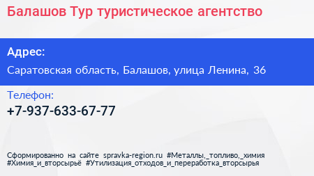 Балашов-Тур, туристическое агентство по адресу Саратовская область, Балашов, улица Ленина, 36 в дальнейшем Организация, размещена в следующих категориях: