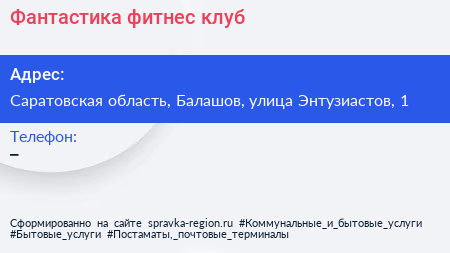 Фантастика, фитнес-клуб по адресу Саратовская область, Балашов, улица Энтузиастов, 1 в дальнейшем Организация, размещена в следующих категориях: