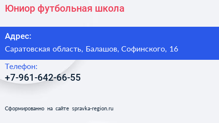 Юниор, футбольная школа по адресу Саратовская область, Балашов, Софинского, 16 в дальнейшем Организация, размещена в следующих категориях: