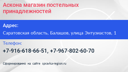 Аскона, магазин постельных принадлежностей по адресу Саратовская область, Балашов, улица Энтузиастов, 1 в дальнейшем Организация, размещена в следующих категориях: