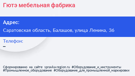 Гютэ, мебельная фабрика по адресу Саратовская область, Балашов, улица Ленина, 36 в дальнейшем Организация, размещена в следующих категориях: