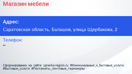 Магазин мебели по адресу Саратовская область, Балашов, улица Щербакова, 2 в дальнейшем Организация, размещена в следующих категориях: