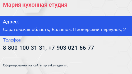 Мария, кухонная студия по адресу Саратовская область, Балашов, Пионерский переулок, 2 в дальнейшем Организация, размещена в следующих категориях:
