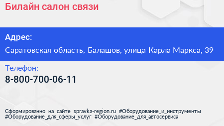 Билайн, салон связи по адресу Саратовская область, Балашов, улица Карла Маркса, 39 в дальнейшем Организация, размещена в следующих категориях: