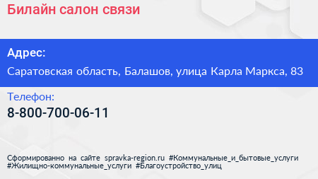Билайн, салон связи по адресу Саратовская область, Балашов, улица Карла Маркса, 83 в дальнейшем Организация, размещена в следующих категориях: