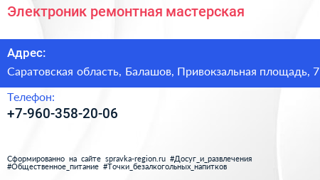 Электроник, ремонтная мастерская по адресу Саратовская область, Балашов, Привокзальная площадь, 7 в дальнейшем Организация, размещена в следующих категориях:
