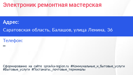 Электроник, ремонтная мастерская по адресу Саратовская область, Балашов, улица Ленина, 36 в дальнейшем Организация, размещена в следующих категориях: