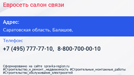 Евросеть, салон связи по адресу Саратовская область, Балашов, в дальнейшем Организация, размещена в следующих категориях: