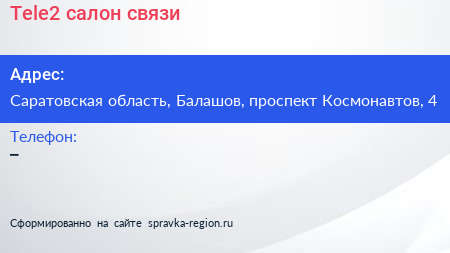Tele2, салон связи по адресу Саратовская область, Балашов, проспект Космонавтов, 4 в дальнейшем Организация, размещена в следующих категориях: