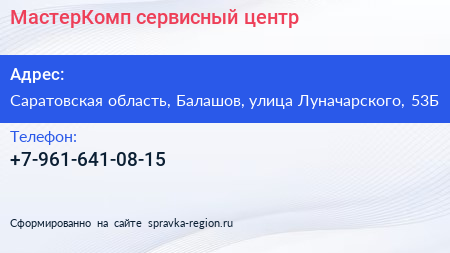 МастерКомп, сервисный центр по адресу Саратовская область, Балашов, улица Луначарского, 53Б в дальнейшем Организация, размещена в следующих категориях: