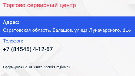 Торгово-сервисный центр по адресу Саратовская область, Балашов, улица Луначарского, 116 в дальнейшем Организация, размещена в следующих категориях: