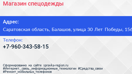 Магазин спецодежды по адресу Саратовская область, Балашов, улица 30 Лет Победы, 156 в дальнейшем Организация, размещена в следующих категориях: