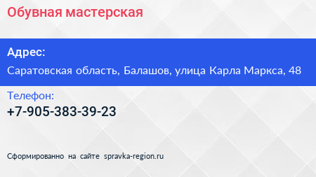 Обувная мастерская по адресу Саратовская область, Балашов, улица Карла Маркса, 48 в дальнейшем Организация, размещена в следующих категориях: