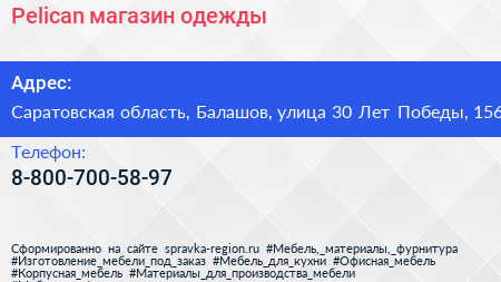 Pelican, магазин одежды по адресу Саратовская область, Балашов, улица 30 Лет Победы, 156 в дальнейшем Организация, размещена в следующих категориях: