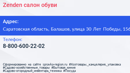 Zenden, салон обуви по адресу Саратовская область, Балашов, улица 30 Лет Победы, 156 в дальнейшем Организация, размещена в следующих категориях: