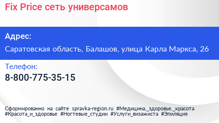 Fix Price, сеть универсамов по адресу Саратовская область, Балашов, улица Карла Маркса, 26 в дальнейшем Организация, размещена в следующих категориях: