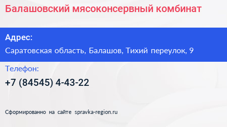 Балашовский мясоконсервный комбинат по адресу Саратовская область, Балашов, Тихий переулок, 9 в дальнейшем Организация, размещена в следующих категориях: