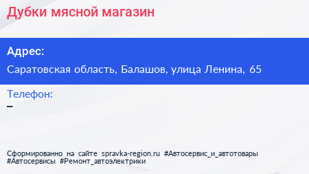 Дубки, мясной магазин по адресу Саратовская область, Балашов, улица Ленина, 65 в дальнейшем Организация, размещена в следующих категориях: