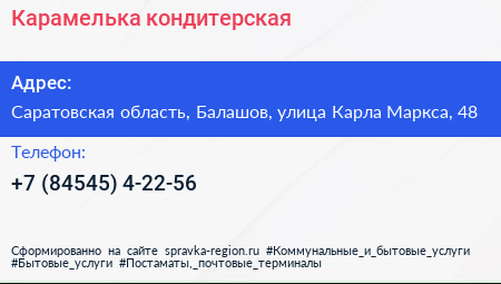 Карамелька, кондитерская по адресу Саратовская область, Балашов, улица Карла Маркса, 48 в дальнейшем Организация, размещена в следующих категориях: