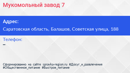 Мукомольный завод №7 по адресу Саратовская область, Балашов, Советская улица, 188 в дальнейшем Организация, размещена в следующих категориях: