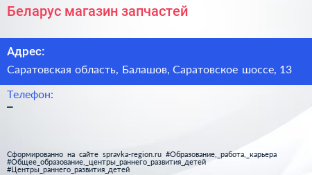 Беларус, магазин запчастей по адресу Саратовская область, Балашов, Саратовское шоссе, 13 в дальнейшем Организация, размещена в следующих категориях: