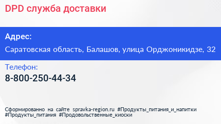 DPD, служба доставки по адресу Саратовская область, Балашов, улица Орджоникидзе, 32 в дальнейшем Организация, размещена в следующих категориях:
