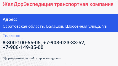 ЖелДорЭкспедиция, транспортная компания по адресу Саратовская область, Балашов, Шоссейная улица, 9в в дальнейшем Организация, размещена в следующих категориях: