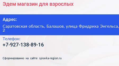 Эдем, магазин для взрослых по адресу Саратовская область, Балашов, улица Фридриха Энгельса, 2 в дальнейшем Организация, размещена в следующих категориях: