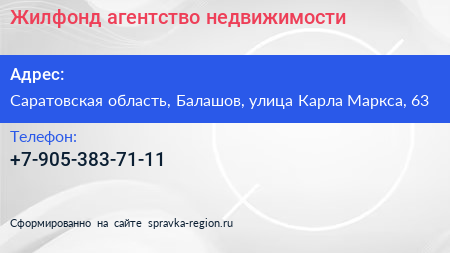 Жилфонд, агентство недвижимости по адресу Саратовская область, Балашов, улица Карла Маркса, 63 в дальнейшем Организация, размещена в следующих категориях: