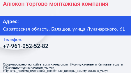 Алюкон, торгово-монтажная компания по адресу Саратовская область, Балашов, улица Луначарского, 61 в дальнейшем Организация, размещена в следующих категориях: