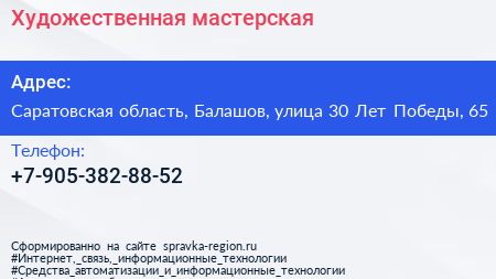 Художественная мастерская по адресу Саратовская область, Балашов, улица 30 Лет Победы, 65 в дальнейшем Организация, размещена в следующих категориях: