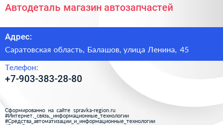Автодеталь, магазин автозапчастей по адресу Саратовская область, Балашов, улица Ленина, 45 в дальнейшем Организация, размещена в следующих категориях: