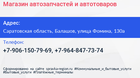 Магазин автозапчастей и автотоваров по адресу Саратовская область, Балашов, улица Фомина, 130а в дальнейшем Организация, размещена в следующих категориях: