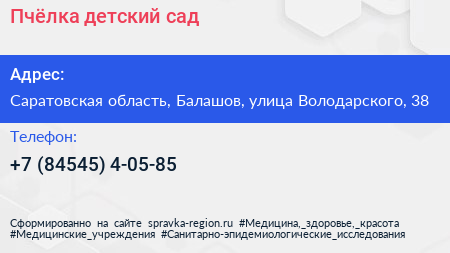 Пчёлка, детский сад по адресу Саратовская область, Балашов, улица Володарского, 38 в дальнейшем Организация, размещена в следующих категориях: