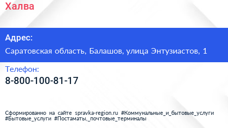 Халва по адресу Саратовская область, Балашов, улица Энтузиастов, 1 в дальнейшем Организация, размещена в следующих категориях: