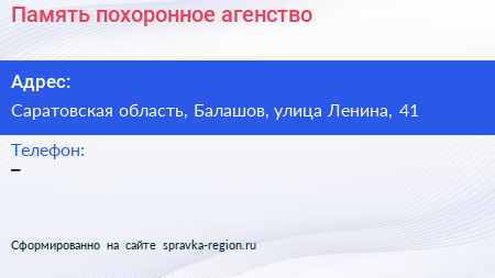 Память, похоронное агенство по адресу Саратовская область, Балашов, улица Ленина, 41 в дальнейшем Организация, размещена в следующих категориях:
