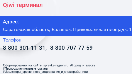 Qiwi, терминал по адресу Саратовская область, Балашов, Привокзальная площадь, 1 в дальнейшем Организация, размещена в следующих категориях: