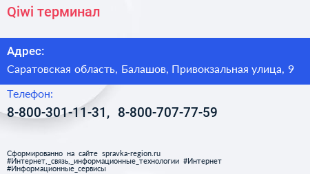 Qiwi, терминал по адресу Саратовская область, Балашов, Привокзальная улица, 9 в дальнейшем Организация, размещена в следующих категориях: