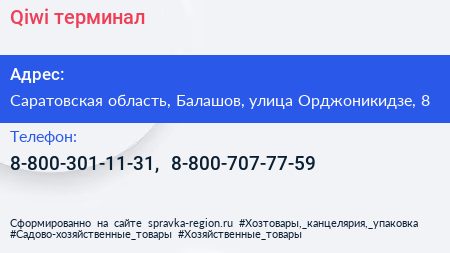 Qiwi, терминал по адресу Саратовская область, Балашов, улица Орджоникидзе, 8 в дальнейшем Организация, размещена в следующих категориях: