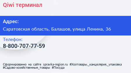 Qiwi, терминал по адресу Саратовская область, Балашов, улица Ленина, 36 в дальнейшем Организация, размещена в следующих категориях: