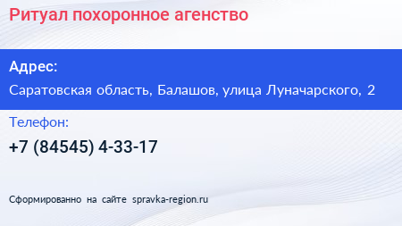 Ритуал, похоронное агенство по адресу Саратовская область, Балашов, улица Луначарского, 2 в дальнейшем Организация, размещена в следующих категориях: