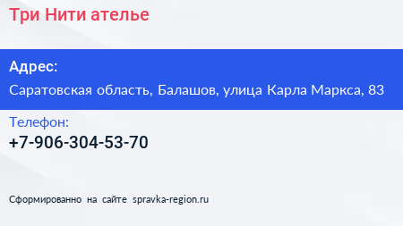 Три Нити, ателье по адресу Саратовская область, Балашов, улица Карла Маркса, 83 в дальнейшем Организация, размещена в следующих категориях: