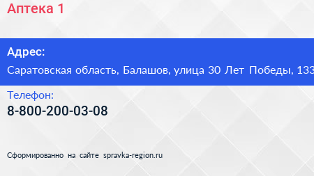 Аптека №1 по адресу Саратовская область, Балашов, улица 30 Лет Победы, 133 в дальнейшем Организация, размещена в следующих категориях: