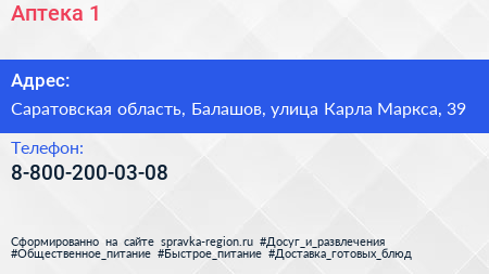 Аптека №1 по адресу Саратовская область, Балашов, улица Карла Маркса, 39 в дальнейшем Организация, размещена в следующих категориях: