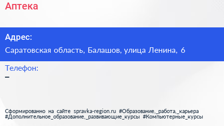 Аптека по адресу Саратовская область, Балашов, улица Ленина, 6 в дальнейшем Организация, размещена в следующих категориях: