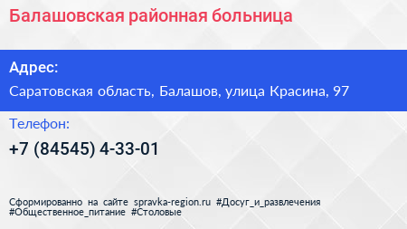 Балашовская районная больница по адресу Саратовская область, Балашов, улица Красина, 97 в дальнейшем Организация, размещена в следующих категориях: