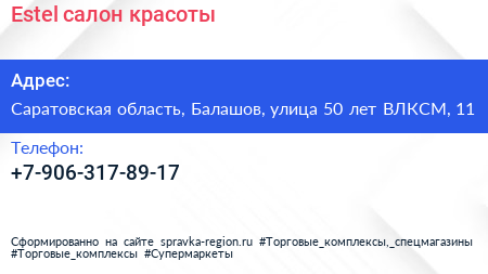 Estel, салон красоты по адресу Саратовская область, Балашов, улица 50 лет ВЛКСМ, 11 в дальнейшем Организация, размещена в следующих категориях: