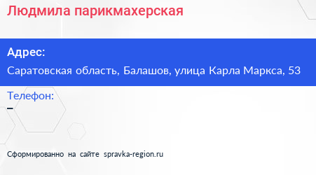 Людмила, парикмахерская по адресу Саратовская область, Балашов, улица Карла Маркса, 53 в дальнейшем Организация, размещена в следующих категориях: