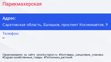 Парикмахерская по адресу Саратовская область, Балашов, проспект Космонавтов, 9 в дальнейшем Организация, размещена в следующих категориях: