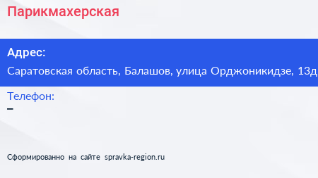 Парикмахерская по адресу Саратовская область, Балашов, улица Орджоникидзе, 13д в дальнейшем Организация, размещена в следующих категориях: